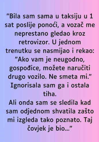 Večer je bila oblačna i tiha, kazaljke su pokazale oko 13:00 poslije ponoći kada sam slučajno bio sam u taksiju. Vozač me promatrao kroz retrovizor, a zatim se pretvarao da se lagano nasmiješio i rekao izjavu od koje sam se naježio: Ako vam je neugodno, gospođice, možete uzeti drugi auto. ja nemam problema Nije bilo potrebe za odgovorom, pa sam šutjela, ali njegova pojava izazvala je nelagodu koju nisam mogla kontrolirati. Kako suminute prolazile, počela sam shvaćati zašto je lice tog čovjeka toliko povezano sa mnom.
