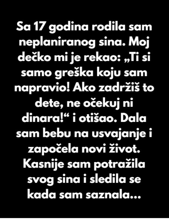 - Kako su godine prolazile, Elena je sve više razmišljala o svom sinu. U trenucima tišine, dok je bila sama sa svojim mislima, često je zamišljala kako je on odrastao, kakve interese ima i šta bi bilo da je ona ostala sa njim. Njena potraga za odgovorima postajala je sve intenzivnija, a ona nije mogla da se oslobodi pitanja: „Šta bi bilo kad bi bilo?“ Nije bila spremna na onu bolnu istinu koja je čekala, ali znala je da je vreme da pokuša da nađe svog sina.