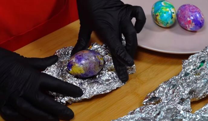 Nakon toga jaje se stavi na dio folije gdje se nalaze boje, a zatim se pažljivo umota tako da boje dodiruju cijelu površinu ljuske. Jaje se potom lagano rola između dlanova kako bi se boje prirodno rasporedile i pomiješale. Nema potrebe za jakim pritiskom, jer je cilj da se dobije spontan i nepredvidiv uzorak. Nakon nekoliko minuta, folija se pažljivo uklanja i tada dolazi trenutak iznenađenja.