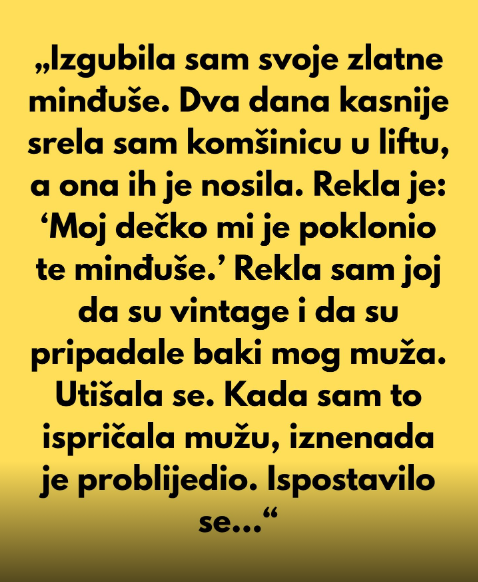 Nakon što je izgubila svoje dragocjene zlatne naušnice, za koje se govorilo da potječu od bake njezina supruga, Jana je bila očajna. Ove su naušnice bile značajne zbog svoje emocionalne vrijednosti za nju, koja je predstavljala predanost i ljubav prema njezinoj obitelji. Nakon dva dana, Marija se slučajno našla u liftu, pa je prepoznala svoju obližnju susjedu. Smiješila se i imala je sjajne naušnice koje su zračile na sunčevoj svjetlosti. Ono što je trebao biti izravan susret pretvorilo se u dramatičan trenutak kada je Jana prepoznala da je Maria stavila naušnice.