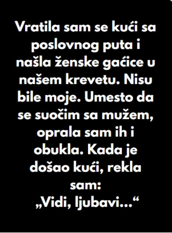 Nakon nekoliko dana poslovnog putovanja, žena u ovoj priči vratila se kući s namjerom da se opusti, predahne i uživa u mirnoj večeri sa svojim suprugom. Umorna, ali sretna zbog uspješnog pothvata, dočekala je ulazak u stan s osmijehom na licu, ne razmišljajući da će joj se život potpuno promijeniti za samo nekoliko minuta. Ušla je u spavaću sobu i, s koferom u ruci, provirila je preko kreveta. U početku je sve izgledalo tipično, ali onda je primijetila nešto što nije u redu. Na jastuku su bile ženske gaćice.