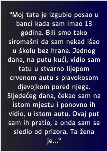 Nisam mogao vjerovati svojim očima. U tom su trenutku bili prisutni bol, sram i simptomi alergije na ljutnju. Sutradan sam, potaknut neizdrživom znatiželjom i strahom, ponovio isto putovanje. Opet isti sastav. Moj otac, isto vozilo, ista mlada dama. Ovaj put sam ih odlučio slijediti. Kad su zaustavili auto, kao i kad sam je vidio kako ga grli, svijet je stao. Osjećala sam se kao da sam izdana, uplašena i zbunjena. Te večeri nisam mogao ostati miran. Povukao sam svu svoju odlučnost i ispričao ocu što sam vidio.