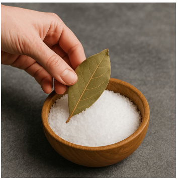 Autentičnost i prirodni miris Osvježivač zraka u ventilaciji kuhinje Kuhanje lovorovog lista u vodi s malom količinom soli stvara ugodan, prirodan miris koji poništava neugodne mirise u kući. Antibakterijska svojstva obje tvari učinkovita su u uklanjanju bakterija iz zraka i pomažu u eliminaciji bakterija, zbog čega je prostor zdraviji i osvježavajući. Čišćenje površina Mješavina lovorovog lista i soli može se koristiti kao prirodni pandan čišćenju. Koristi se za sterilizaciju stolova, pultova i podova, što prostor ostavlja dezinficiranim i energetski odmornim.