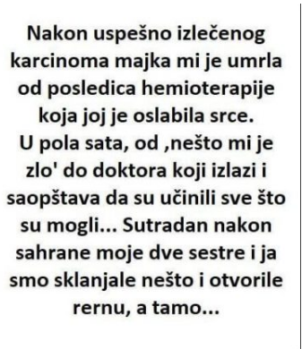 - Hitne službe, liječnici i panika… svi mi, nemoćni i nesposobni shvatiti kako se sve što smo proživjeli može raspasti u nekoliko minuta. Liječnici su sve postigli, ali njihova lica nisu poticala nadu. Njihova lica su izražavala ono što su riječi još uvijek bile nedozvoljene. A kad su to konačno izgovorili, svijet je na trenutak stao. Rečenica koju nitko ne želi slušati je izgovorena. Pobijedila je bolest, ali učinci tog uspjeha bili su preveliki za njezino oslabljeno tijelo.