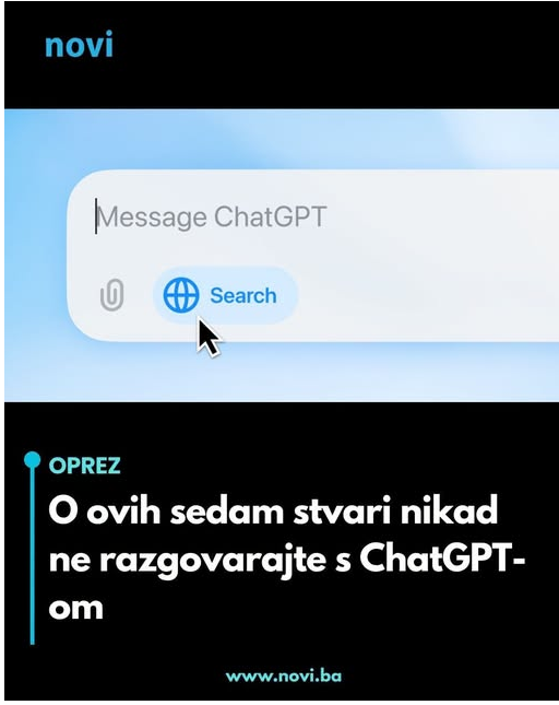 Iako su ovi alati korisni i mogu ubrzati mnoge procese, njihova upotreba dolazi s određenim rizicima. U želji da što brže riješimo neki zadatak, često zaboravimo da s AI alatima dijelimo informacije koje bi mogle biti osjetljive. Iako AI chatboti nisu stvarne osobe, oni čuvaju informacije koje im dajemo, pa je važno biti oprezan s podacima koje dijelimo.