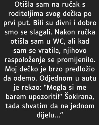 Prvi put sam imala priliku ručati s roditeljima svog partnera. Bili su iznimni i uživali smo u simbiotskom odnosu među njima. Nakon ručka otišla sam u WC, ali po povratku sam primijetila promjenu u njihovom ponašanju. Moj partner je odmah predložio da idemo. Komentirao je u autu: Mogli ste me barem obavijestiti! Na svoj užas, prepoznala sam značajan smeđi trag na stražnjoj strani hlača.