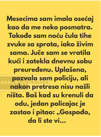 Kad se vratila s posla, dočekala ju je slika koja ju je emocionalno uznemirila: dnevni boravak nije nalikovao prostoru koji je izvorno napustila. Stolić za kavu bio je pomaknut, tepih je bio lagano presavijen kao da je netko projurio bez zaustavljanja, a knjige na policama bile su organizirane drugačijim redoslijedom. Nije se radilo o slučajnom pomicanju: činilo se kao da je netko namjerno premjestio prostor. Zatim se strah pojačao tijekom nekoliko dana. Ušla je u spavaću sobu, a zatim je pozvala policiju. Kad su policajci stigli, temeljito su pretražili kuću. Pregledali su vrata, prozore, podrum i tavane – svaki prostor u kojem bi se netko nepoznat mogao sakriti.