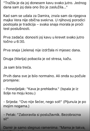 Moja priča počinje Damirovim vjenčanjem. Svi u njegovoj obitelji bili su svjesni činjenice da je njegova majka Vera imala visoka očekivanja. Njezin ugled i očekivanja u vezi s kćeri bili su dokumentirani, ali nisam razumjela cijelu priču dok se nisam uključila u obitelj. Prvi test koji sam morala uspješno proći bio je jednostavan, ali i ključan: svako jutro, u 6:30, morala sam joj donijeti šalicu kave da popije u krevetu. Unatoč prividnoj beznačajnosti ovog zahtjeva, ispod njega su tradicije i očekivanja koja imaju duboke korijene i koja često čine moje svakodnevne zadatke.