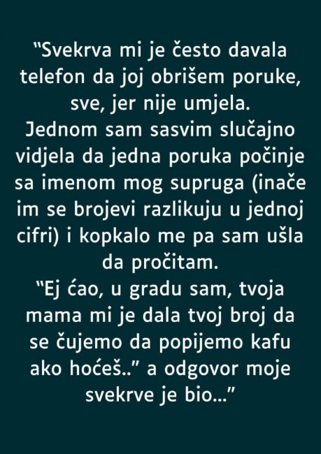 Stres koji dolazi iz razbijenog poverenja i otkrivanja istine može biti izuzetno dubok i bolan. U ovoj priči, žena koja je godinama verovala svom partneru, suočila se sa nečim što je potpuno promenilo njen pogled na njihov brak. Kao žena koja je godinama pomagala svojoj svekrvi, nije imala razloga da sumnja u svoj brak. Nije ni pomislila da bi nešto moglo biti skriveno, sve dok nije naišla na poruku na svom muževom telefonu, koja je bila dovoljno neobična da je natjera da se zapita.