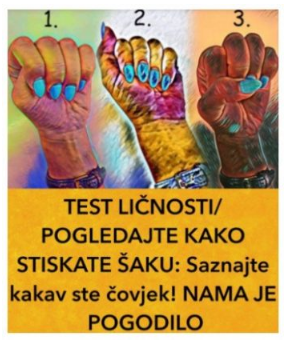 Ovo jednostavno ponašanje može poslužiti kao pokazatelj naših skrivenih emocija, načina na koji rješavamo probleme i načina na koji se povezujemo s drugima. Različiti pristupi držanju za ruke i njihove povezane poruke. Jedan od najzanimljivijih aspekata ovog testa je način na koji stišćete šaku, što može pokazati različite karakteristike ličnosti. Na primjer, ako vam palac prekriva sve prste, to se smatra osobom koja voli i pokušava pomoći drugima.