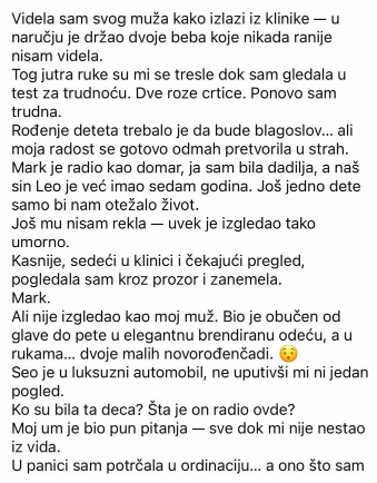 Kasnije, rekla je, ispričat ću vam kasnije, ali za sada ću vam reći da se dogodio pravi trenutak. Nakon nekoliko sati, našla se u čekaonici klinike, okružena mirisom dezinfekcijskog sredstva i bjelinom zidova. Nedostatak buke oko nje samo je povećao njezin stres. Dok je sjedila bez ideje kako dalje, nedostajala joj je svijest da će taj dan zauvijek promijeniti tijek njezina života. Kad je promatrala svog supruga Marka kroz kristalni prozor, činilo se kao da promatra drugog čovjeka.