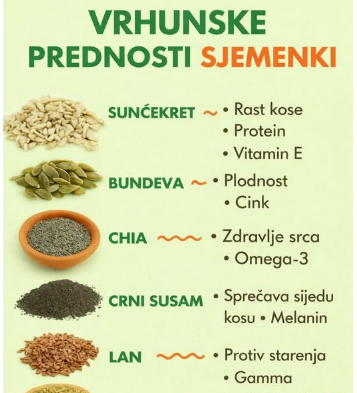 - Stalna konzumacija različitih vrsta sjemenki može pomoći u poboljšanju zdravlja srca, povećanju imuniteta, lijepoj koži i kosi te održavanju hormonske ravnoteže. Njihova mana je što ih je jednostavno dodati obrocima, ali zahtijevaju samo osnovnu pripremu.