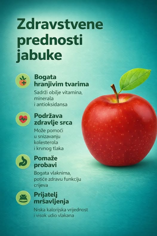 Njena popularnost ne proizlazi samo iz pristupačne cijene i prijatnog, svježeg okusa, već i iz izuzetnog bogatstva hranjivih sastojaka koji pozitivno utiču na cijeli organizam. Iako naizgled djeluje jednostavno, jabuka u sebi krije niz prednosti koje je čine vrijednim i gotovo nezaobilaznim dijelom uravnotežene i svjesne ishrane.