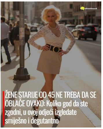 - Umjesto da se bavimo pravilnim i neispravnim načinima odijevanja, raspravimo o uobičajenim pogreškama koje “stare žene” nakon 45. godine: 1. Prekratka odjeća – kratke haljine i kratke hlače koje jedva prekrivaju noge osobe koja ih nosi. Unatoč činjenici da kratke haljine i kratke hlače mogu izgledati “podebljano” na slici, često uzrokuju bol u stvarnom životu. Ova odjeća može otkriti više informacija nego što biste željeli priznati, što sugerira da se borite s vremenom, a ne uživate u njemu.